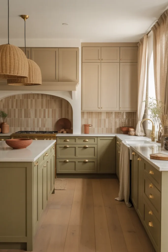 Green and beige kitchen cabinets are great when you want color that still feels calm. Olive lowers and sandy beige uppers create a soft, earthy look that works in both modern and farmhouse kitchens.
