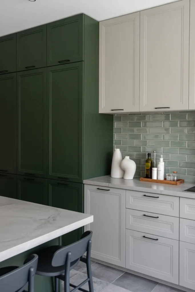 Green and grey kitchen cabinets give a more modern, clean look, especially when you add cool stone finishes. Try a deep green pantry wall and softer gray base cabinets so the color feels intentional, not random.