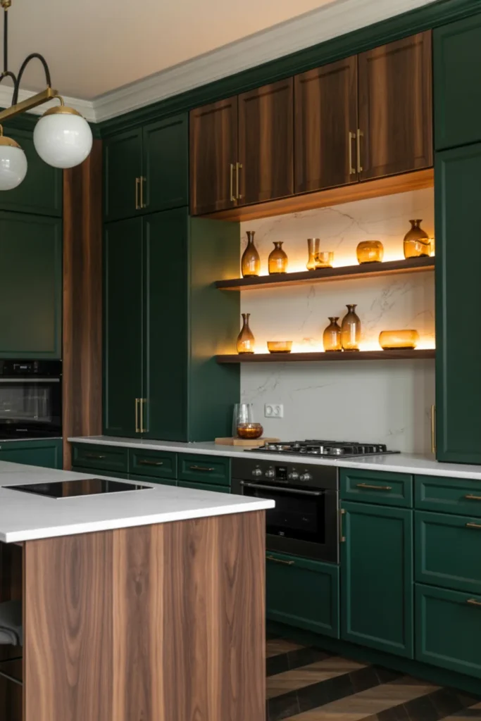 25. Green and Walnut Kitchen Cabinets for Rich Contrast