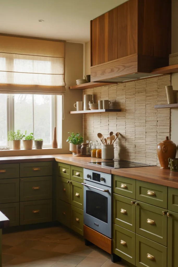 3. Olive Green Kitchen Cabinets With Warm Wood Accents