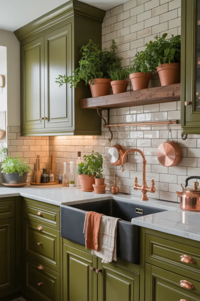 Copper adds a warm glow that makes green kitchen cabinets feel extra special. Olive or moss green works best because it looks natural next to copper’s reddish tone.