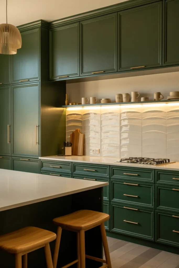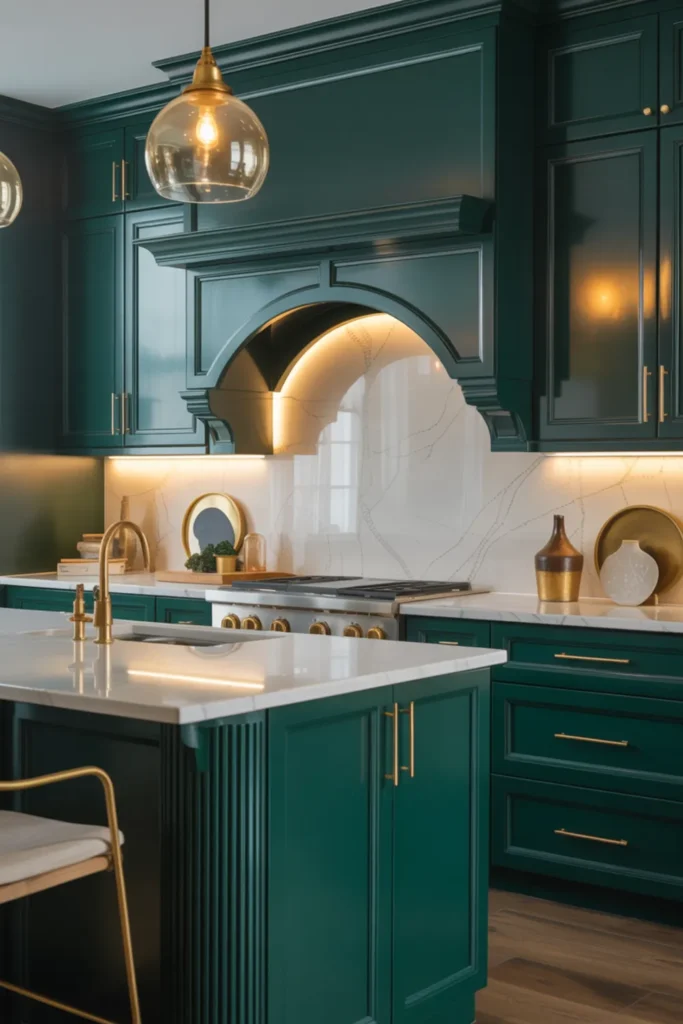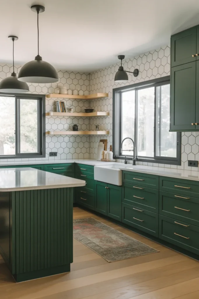 If you want a little edge, bring in black accents like a faucet, pendants, or window frames. White countertops help the deep green look crisp instead of heavy.