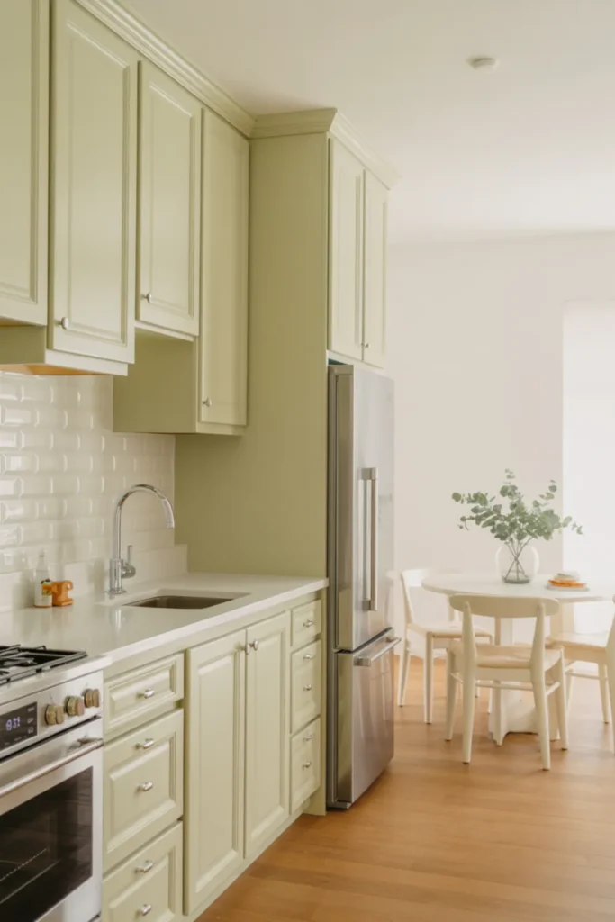 Pistachio green kitchen cabinets are perfect when you want color, but you still want the room to feel bright. Pair them with white countertops and tiny glossy white tiles so the whole space reflects light.