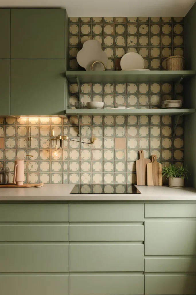 36. Kitchen Backsplash Ideas for Green Cabinets (Patterned Tile)