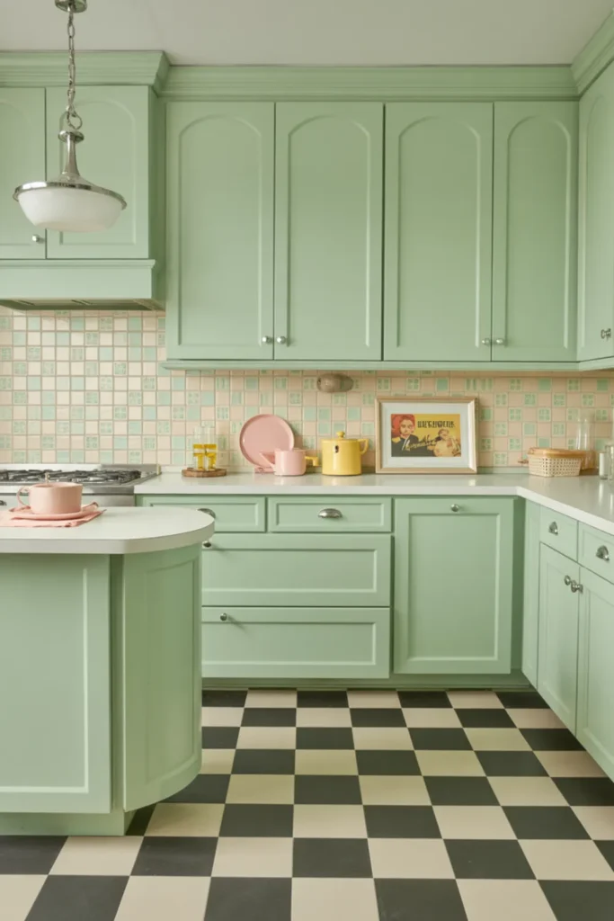7. Mint Green Kitchen Cabinets With Retro Tile Vibes