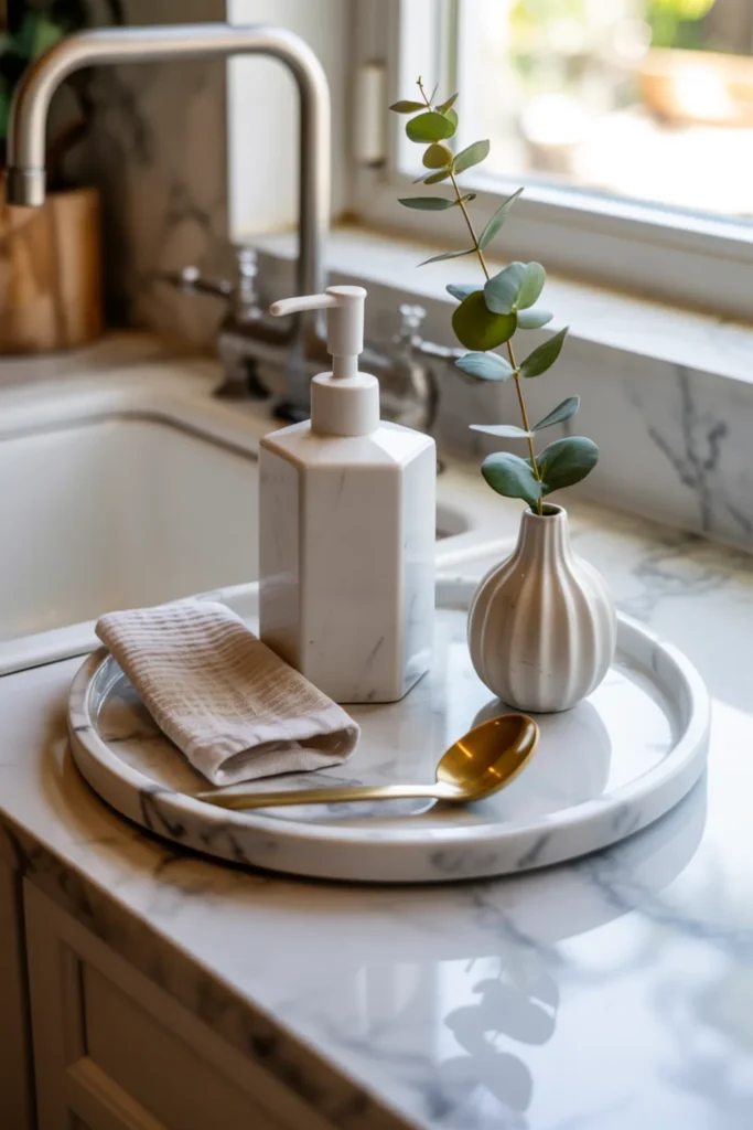 A marble tray makes your kitchen counter decor look pulled together in seconds. Pick one tray and let it “hold” your everyday basics, like soap, a brush, and one small vase.
