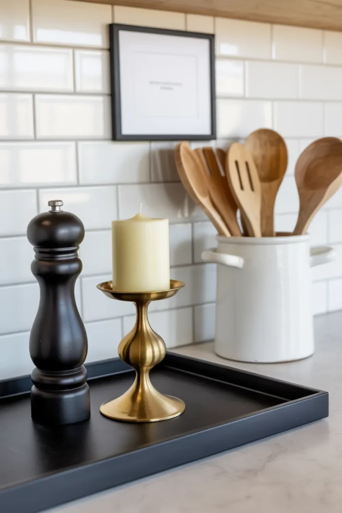 Modern farmhouse accessories look best when you keep the mix tight. Use a small tray to corral a black pepper mill, a white utensil crock, and one brass accent. That tray instantly makes your styled countertops look organized, not scattered.