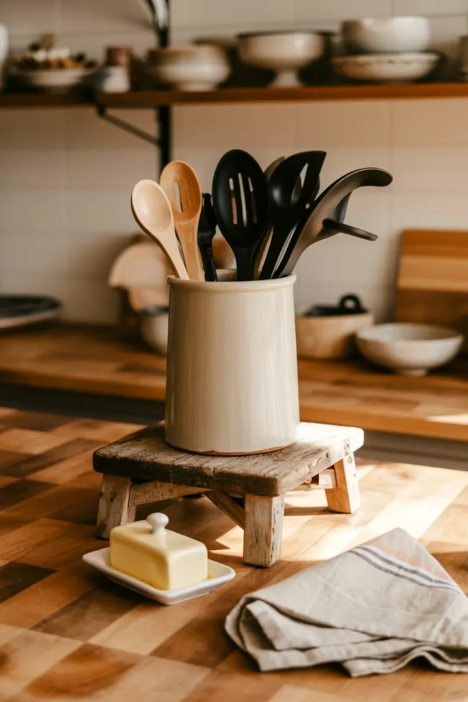 A utensil crock can be both storage and counter decor when you choose tools you don’t mind seeing. Set a sturdy stoneware crock on a small wood riser near the stove, so it feels intentional and easy to grab from.
