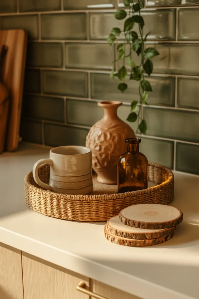 12. Boho Kitchen Counter Styling (Woven Tray + Handmade Pottery)