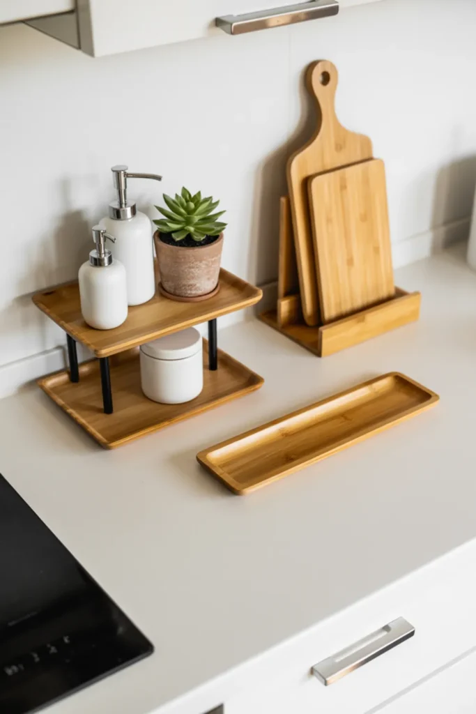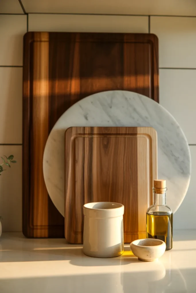 This creates a styled look while keeping your prep area open. Choose boards in tones that match your kitchen style, like warm walnut for cozy kitchens or pale oak for minimalist kitchen design. For extra polish, add a small pinch bowl or spoon rest nearby.