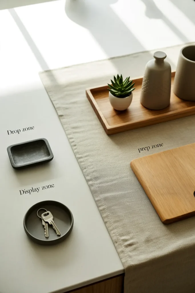 A smart layout keeps your counter decor looking good all day. Create three zones: a clear prep spot, a small display vignette, and a drop zone for keys or mail. Trays are your best friend here because they define the decor area and stop items from spreading.