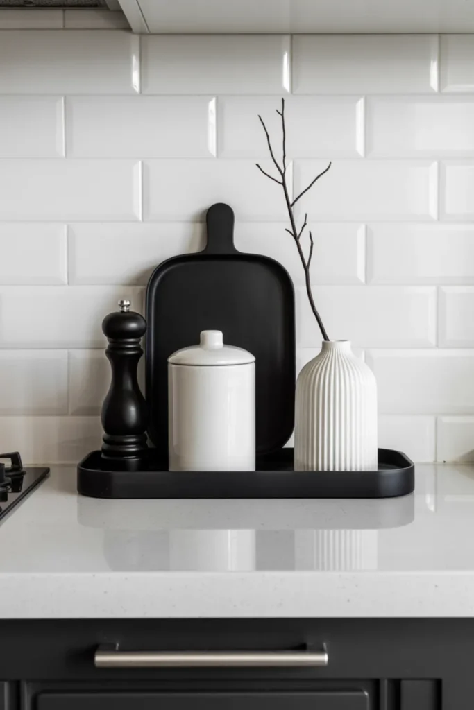 Black and white styling makes your countertops look sharp with almost no effort. Use a black tray to corral a white canister, a black pepper mill, and one simple vase. Clean lines help your modern countertop decor feel intentional instead of random.