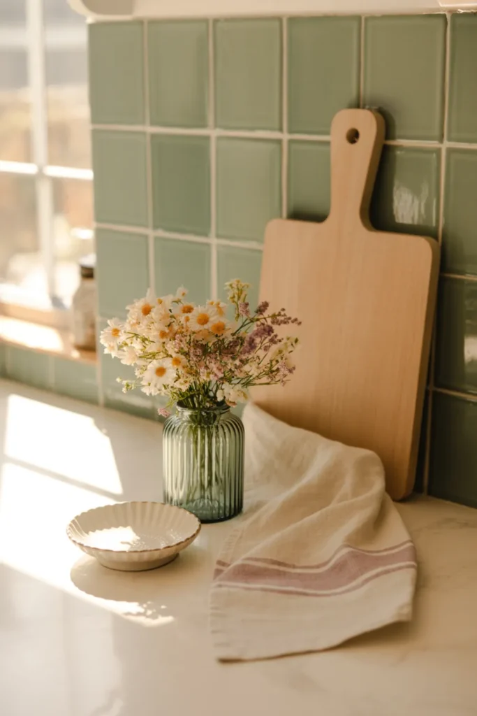A little cottage charm goes a long way on a kitchen counter. Set a ribbed glass vase with simple florals near the backsplash, then layer in a soft patterned towel and a small ceramic dish. Vintage-style pieces make the countertop decor feel collected and homey, not staged.