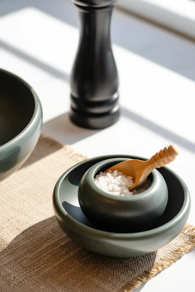 This pairing is tiny, useful, and still looks styled. Place a low decorative bowl next to a matching salt cellar, then add a little wooden spoon to make it feel intentional. Both pieces look good on display and help you cook faster, which is a win for functional design.