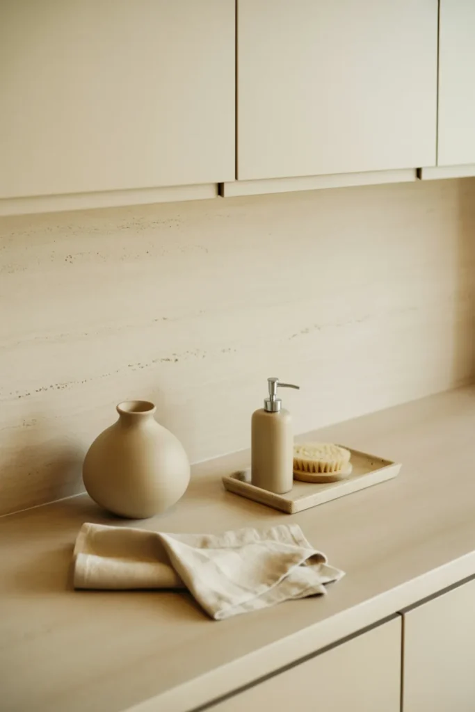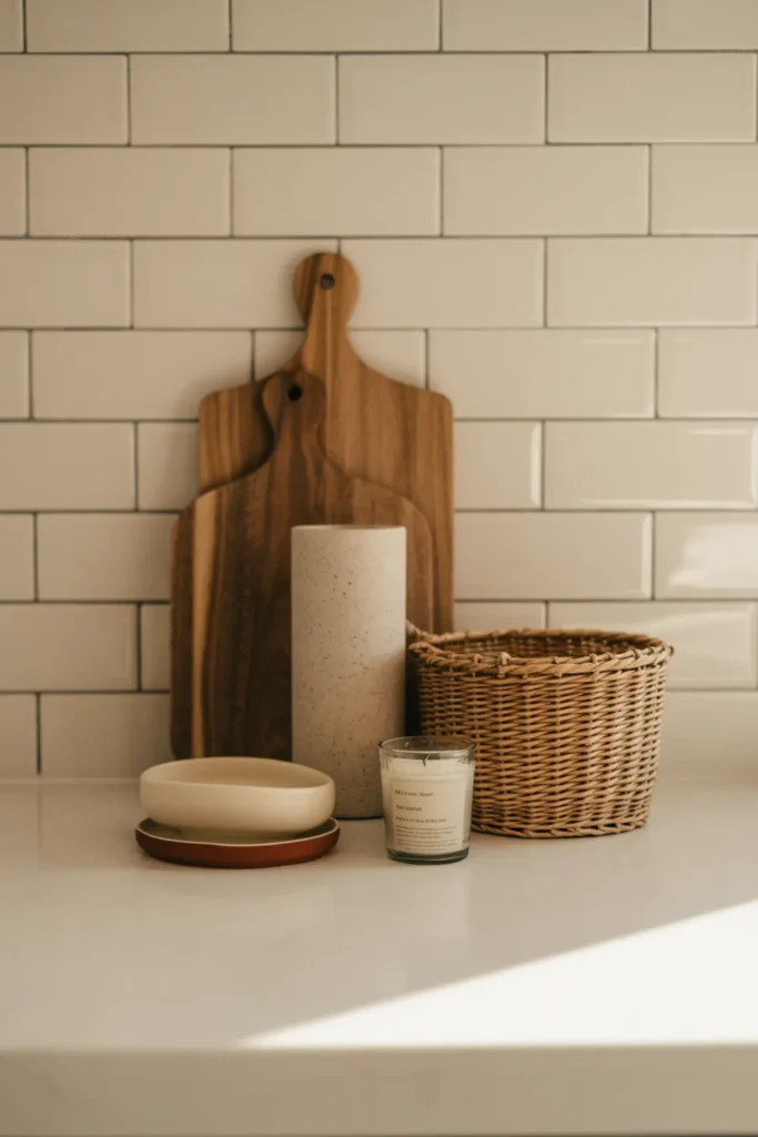 Neutral accessories calm your space fast. Choose three items for your kitchen counter decor, like a linen towel, a matte vase, and a small stone tray for soap. Keep everything in warm whites, creams, or soft taupe so your countertops look clean without trying hard.