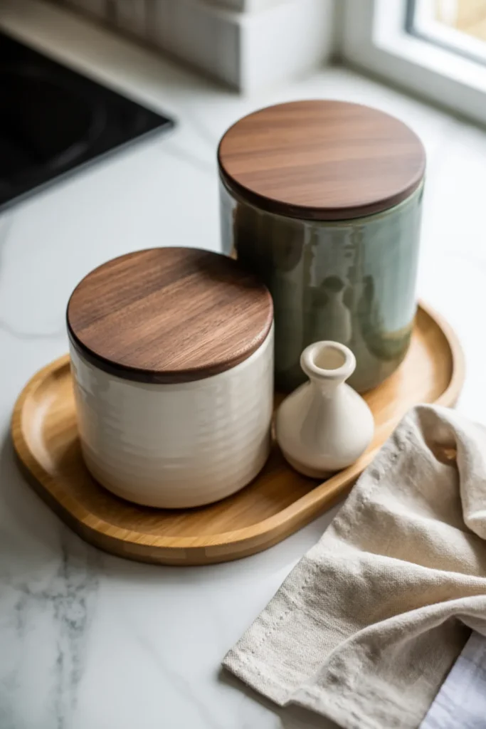 Two materials keep your counter styling simple and polished. Go with warm wood and white ceramic, then choose just a tray, a canister, and one small vase. The tight mix makes your kitchen counter decor feel planned, even on busy days.