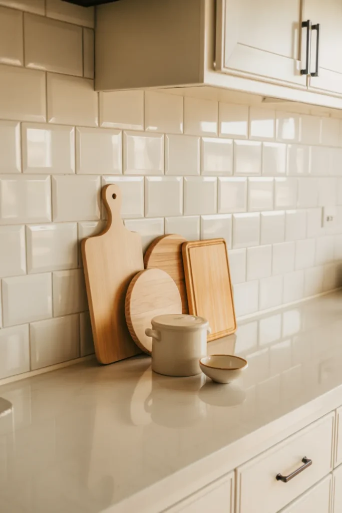 Cutting boards can act like decor when you treat them like a little gallery. Stand three boards of different shapes against the backsplash, then place a crock or bowl in front.