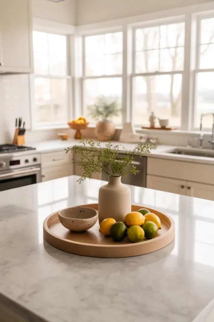 A centered tray is the easiest way to style your kitchen island without making it feel crowded. Keep the base simple, like a neutral tray with a vase and a bowl, then swap one small piece with the season.
