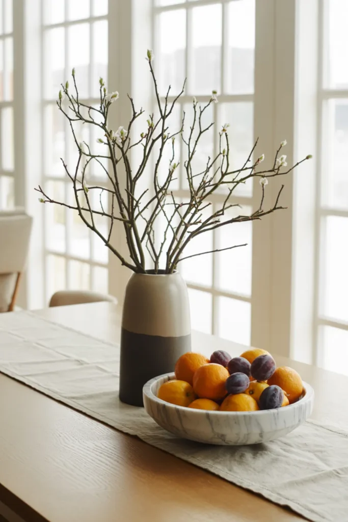 This combo looks balanced because it mixes height and weight. Place a tall vase with branches next to a low bowl with fruit, then ground everything with a tray or runner.