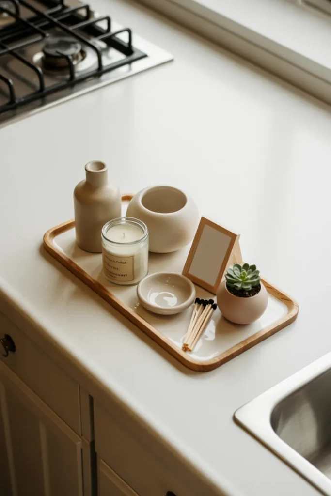 A micro collection looks curated because everything shares the same color mood. Pick a color family, then gather a few small pieces like a tiny vase, a candle jar, a match striker, and a small bowl. Set them on a tray so your kitchen counter decor stays organized and doesn’t spread. Keep it to five to seven items so it stays clean, not busy.
