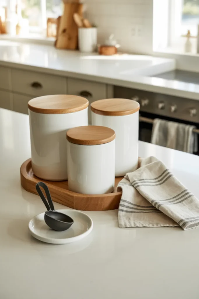 This works especially well in a clutter free kitchen because it keeps your most-used items close without spreading them across the counter. Stick to one color family for a clean look. Want a modern farmhouse touch? Add one black scoop or brass accent.