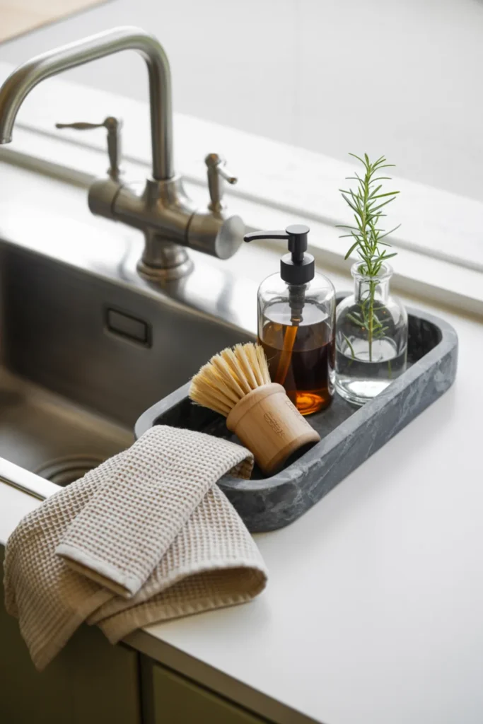 Your sink area can look styled without feeling staged. Start with one slim caddy so your soap and brush stay together. Add a tiny bud vase with rosemary or eucalyptus for a fresh touch that still fits a clutter free kitchen.