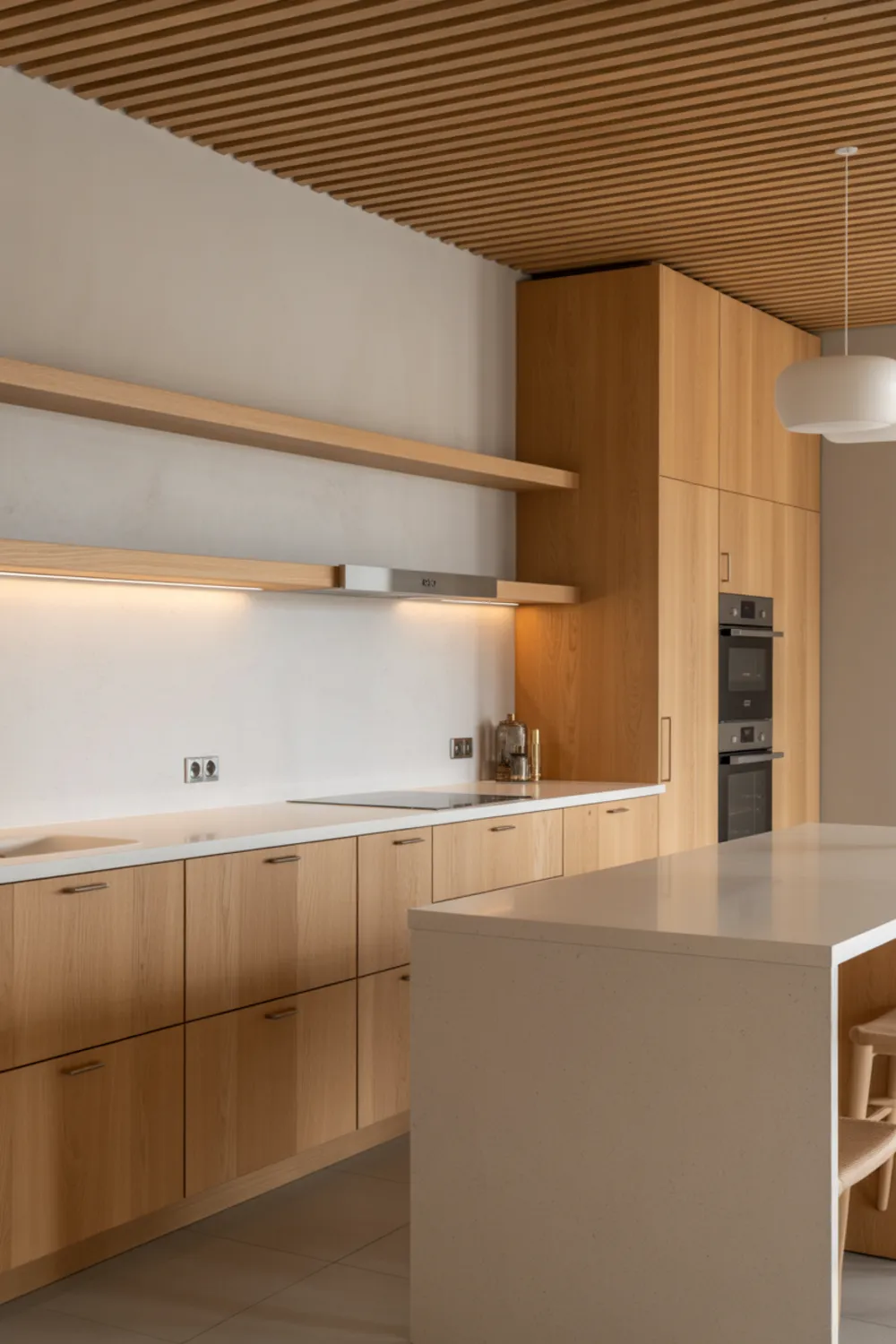 Slim LED strips add a soft glow and make evening cooking feel cozy instead of harsh. Try pairing the wood with matte white or sand-colored countertops for a calm, spa-like result.