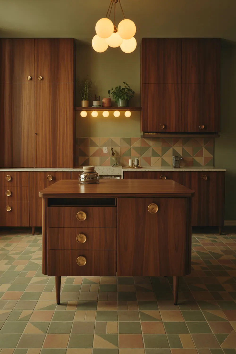 A walnut MCM layout creates a cozy, nostalgic mood that still aligns with modern living. You can bring character into the room with geometric floor tiles or globe pendant lighting inspired by mid-century design.