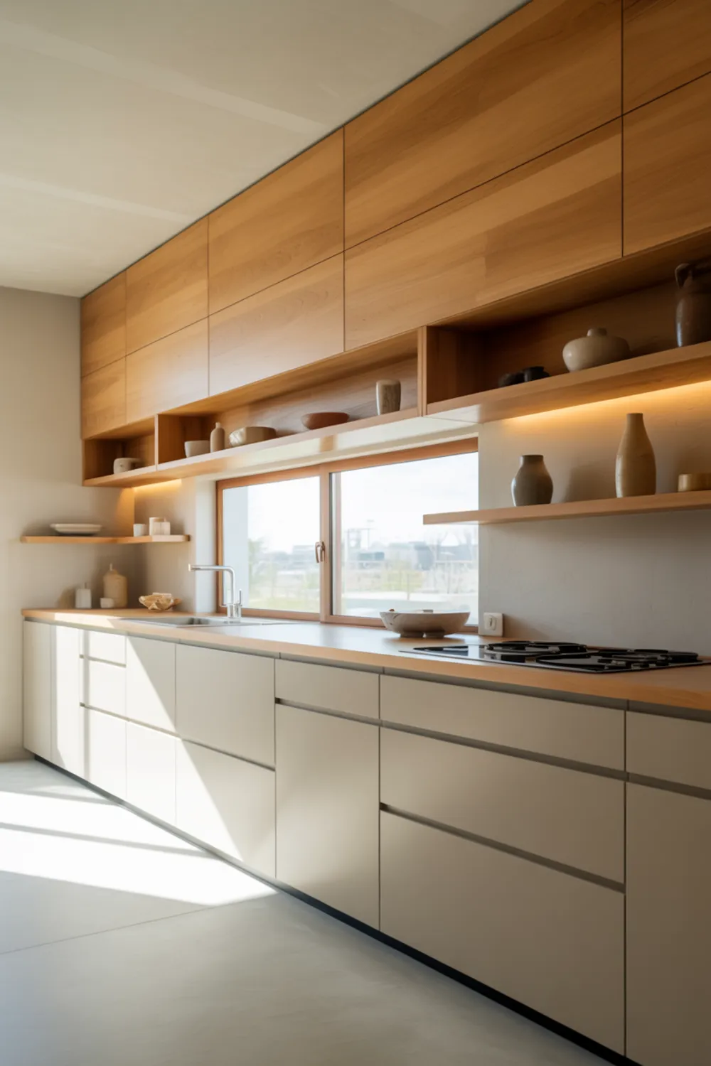 Japandi design fits you if you love calm, natural spaces with a touch of Japanese simplicity and Scandinavian comfort. You might use medium-toned oak cabinets and open wood shelves with a few thoughtfully chosen ceramic pieces.
