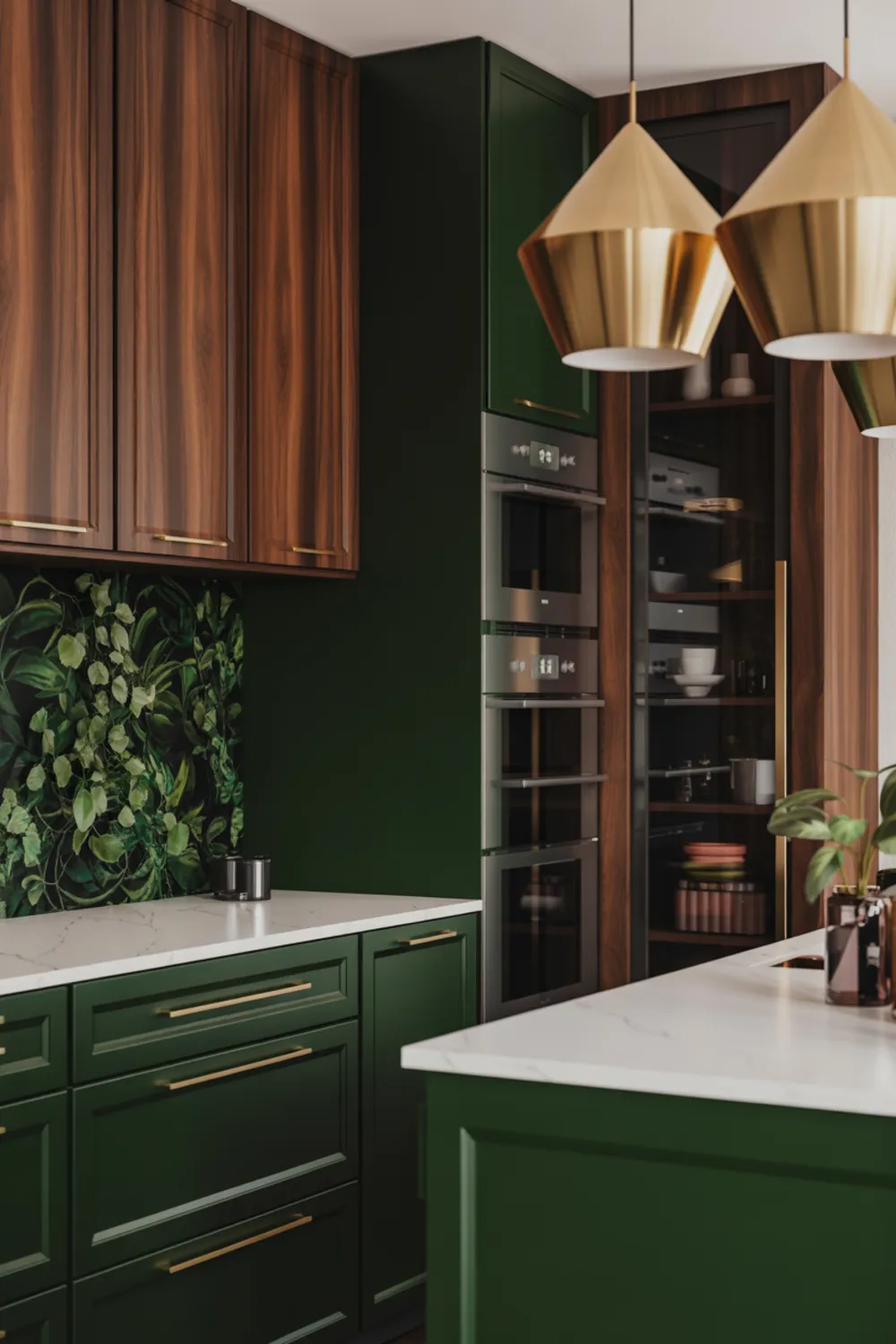 A deep muted green with walnut creates a stylish balance between nature-inspired color and luxury wood tones. You can use green on lower cabinets and walnut above to anchor the space while keeping warmth at eye level.