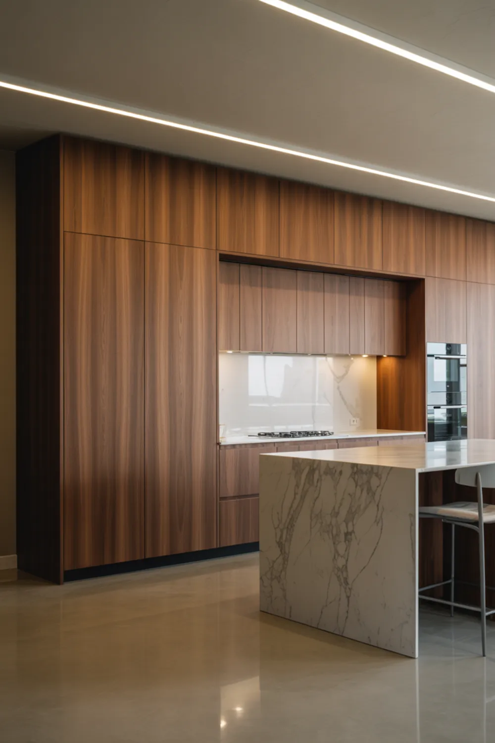 If you want extra texture, fluted walnut or ribbed panels build depth and interest. This style suits condos, lofts, and new builds aiming for bold sophistication.