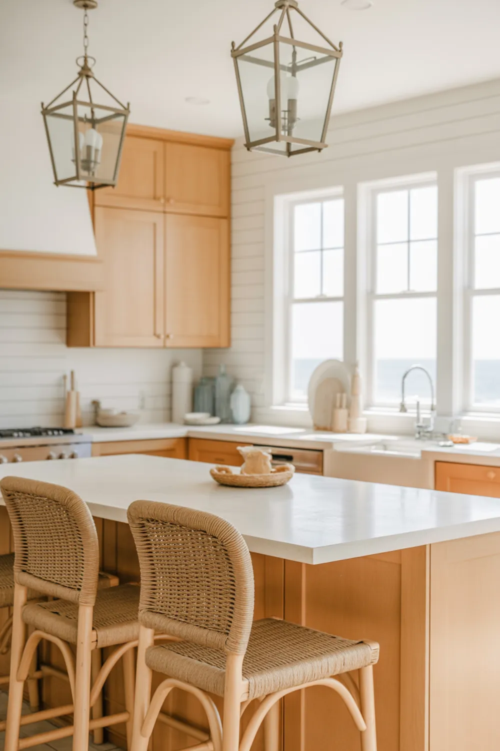 Warm-toned wood pairs beautifully with coastal accents like white stone and woven textures. You can add soft blue or sandy decor to bring in a beach-inspired vibe without going nautical.