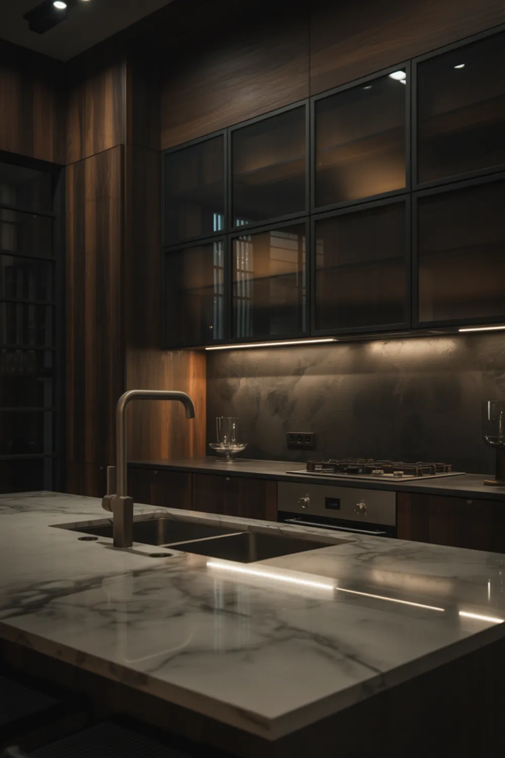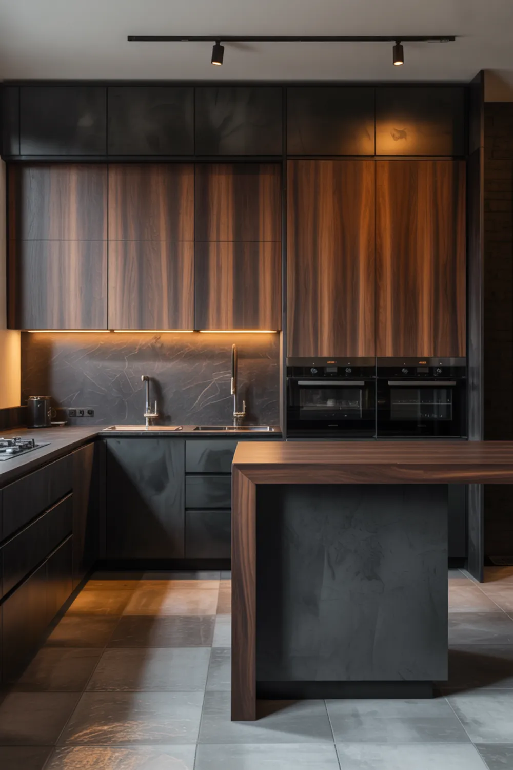 A moody palette gives your kitchen an intimate, high-end lounge feeling. You can use deep espresso wood and matte finishes, then layer warm lighting rather than bright overhead bulbs.