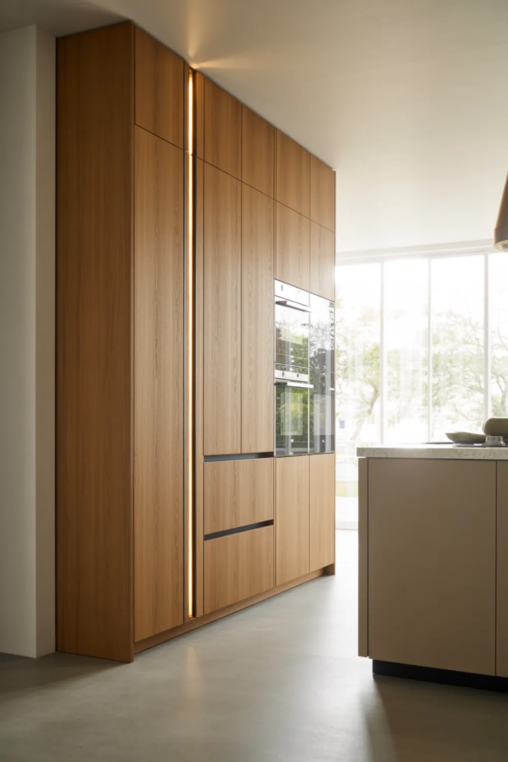 A hidden-line cabinet system creates a futuristic look that blends into surrounding architecture. You can use touch-operated doors and long, smooth wood panels with no visible seams.