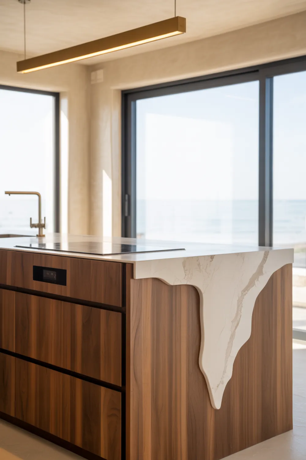 A wood island mixed with waterfall marble sides gives your kitchen an elevated designer look without taking over the whole space. You can choose a marble pattern with soft movement to blend beautifully with walnut or oak.