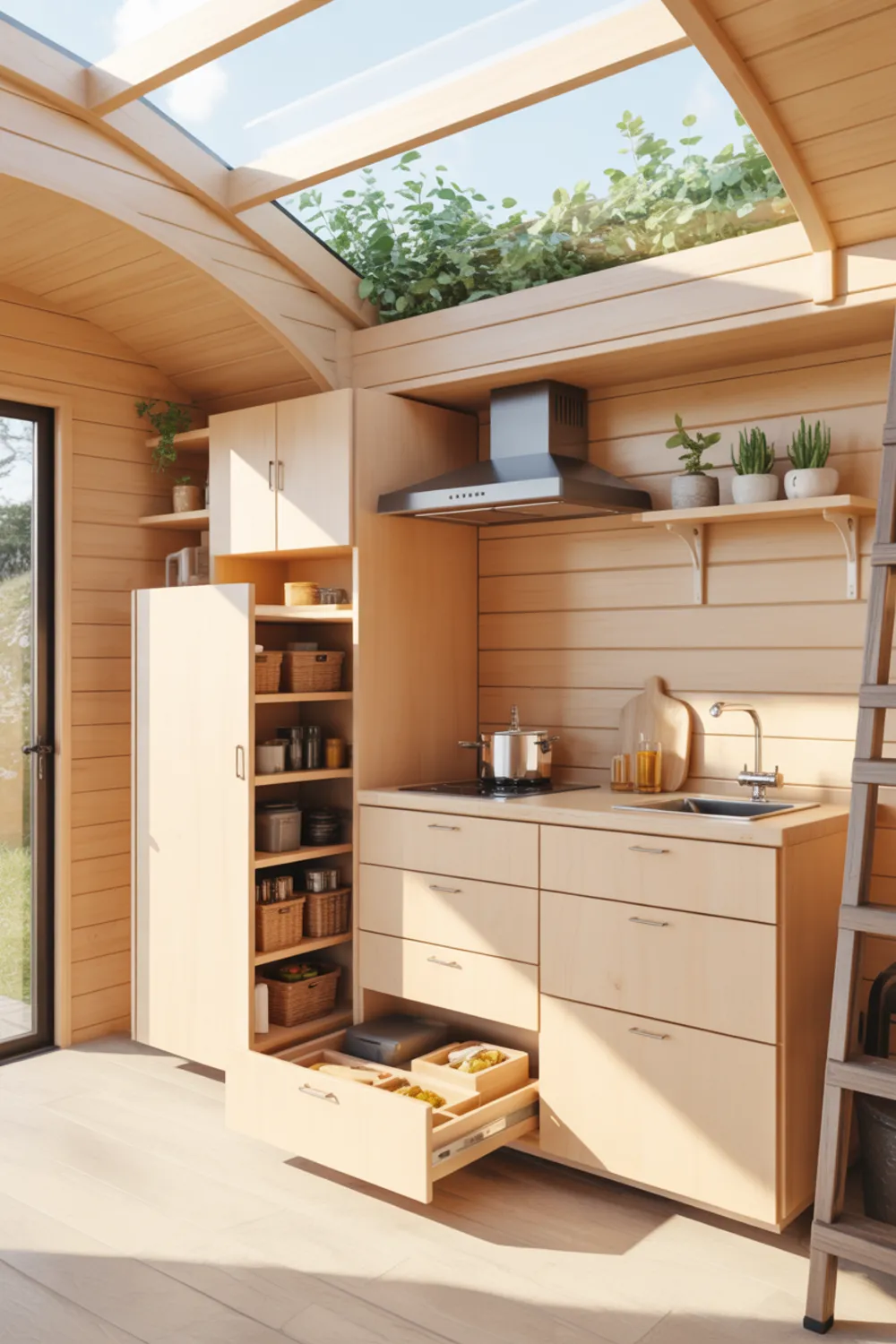 22. Modern Tiny House Wood Kitchen With Smart Storage