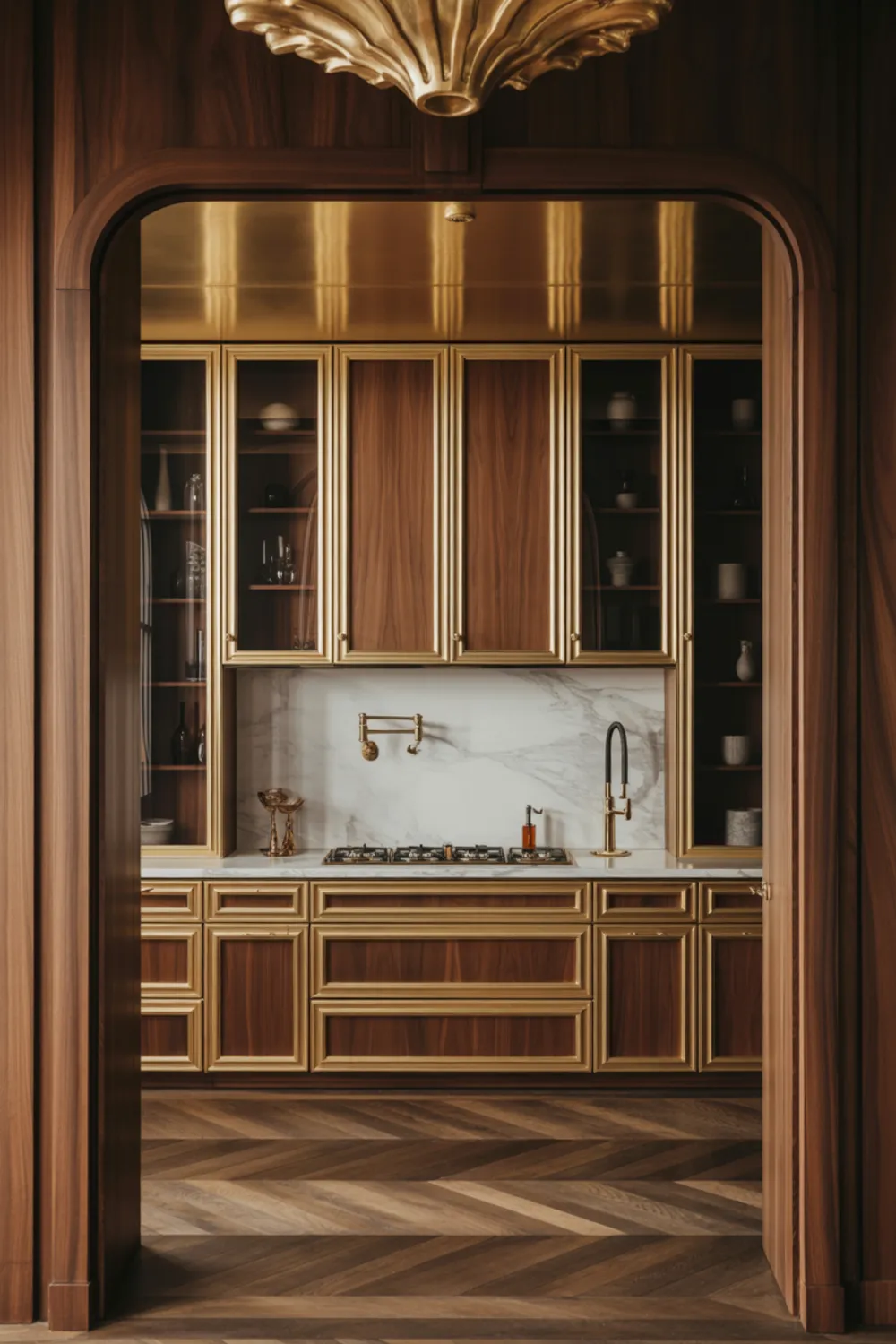 Walnut and brass are a stunning match if you want a refined European-inspired feel. You can use brass trim or glass-framed cabinets to add elegance without taking attention away from the wood.