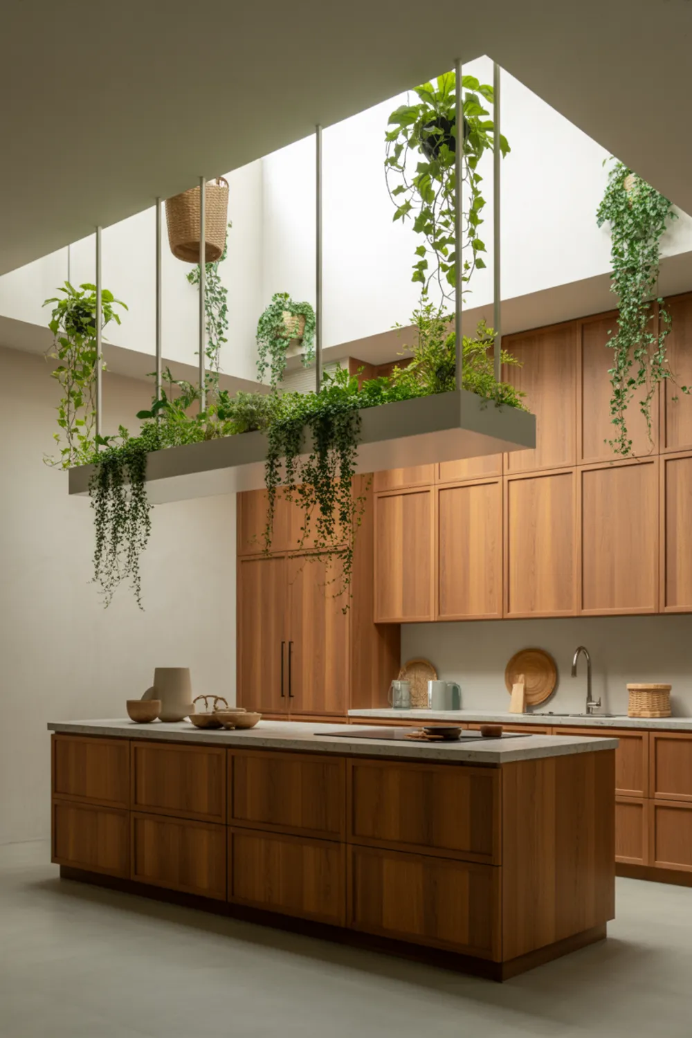 A skylight above the main cooking area brings in natural light that pairs beautifully with warm wood tones. You can add hanging plants or a vertical herb garden to build a fresh, indoor-outdoor feel.