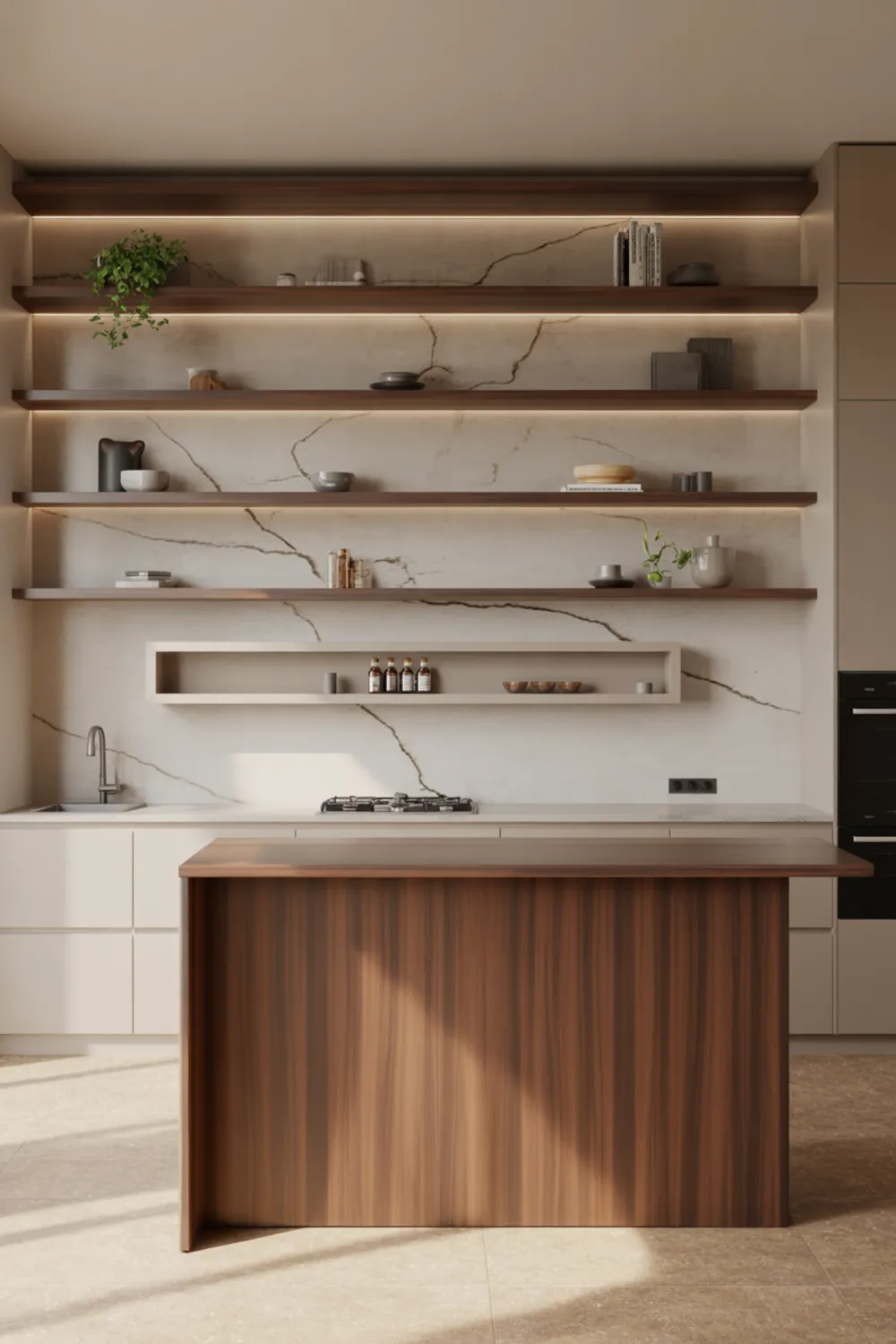 Soft LED lighting under the shelves highlights both the wood and the marble textures at night. Mixing wood shelves with matte fixtures helps maintain a modern, curated feel.