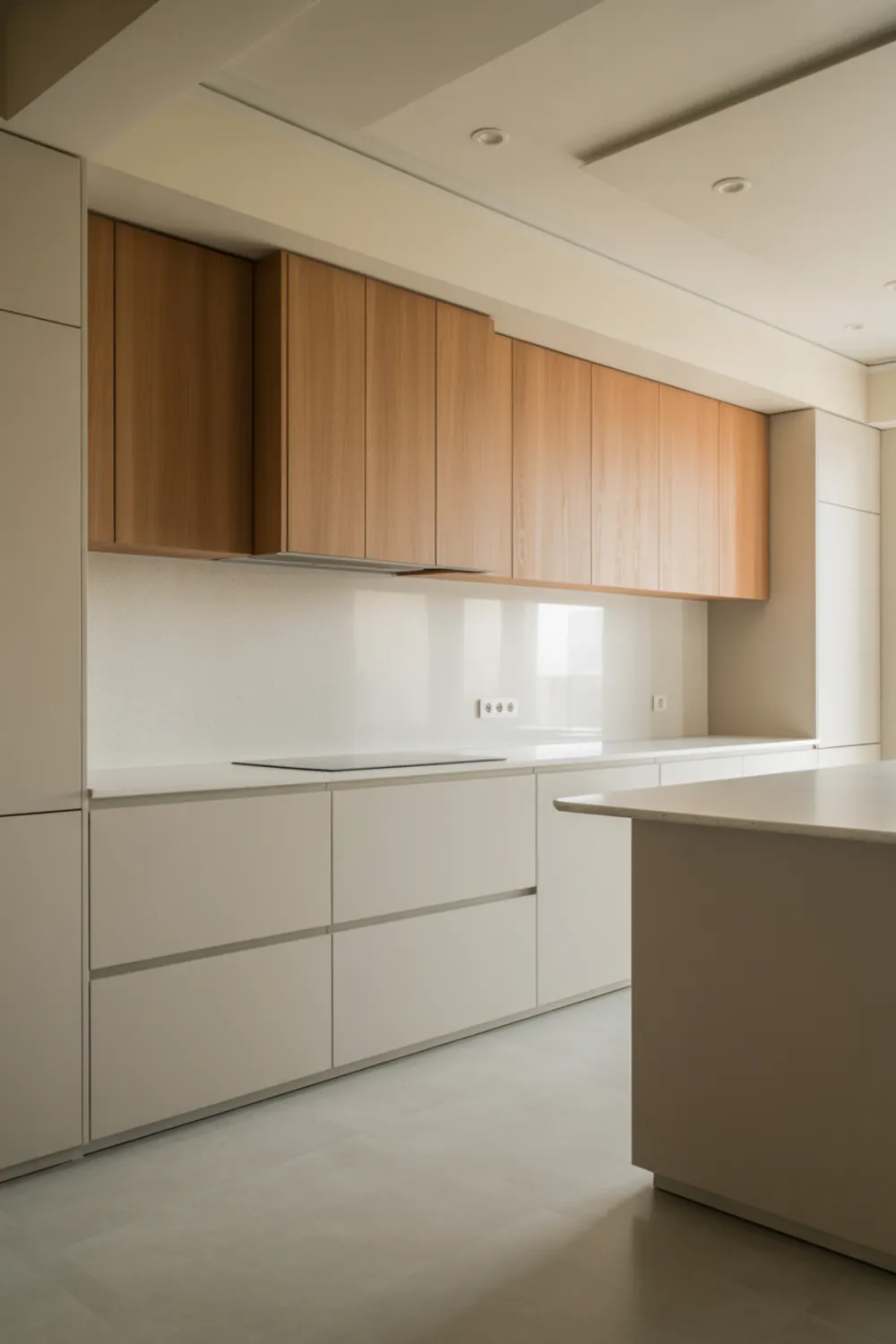 A hidden hood system keeps your kitchen clean and seamless, especially if you love minimalist design. You can use matte white cabinets below and light wood above for a soft, balanced look.