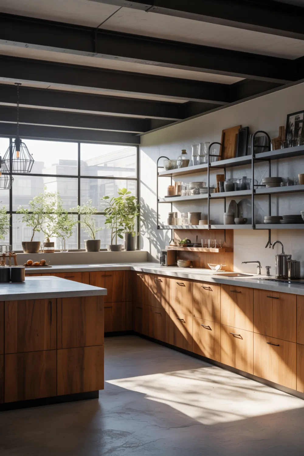 Black metal or steel details reinforce the industrial mood without making the kitchen feel cold. Warm lighting and simple greenery soften the hard surfaces, keeping the room comfortable.
