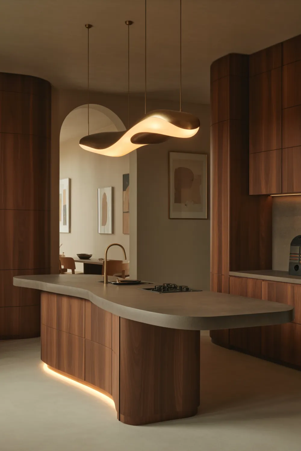 Rounded island edges or sculptural seating create a relaxed, premium feel without being flashy. Bronze or champagne fixtures blend nicely with darker walnut tones for a rich, hotel-style atmosphere.