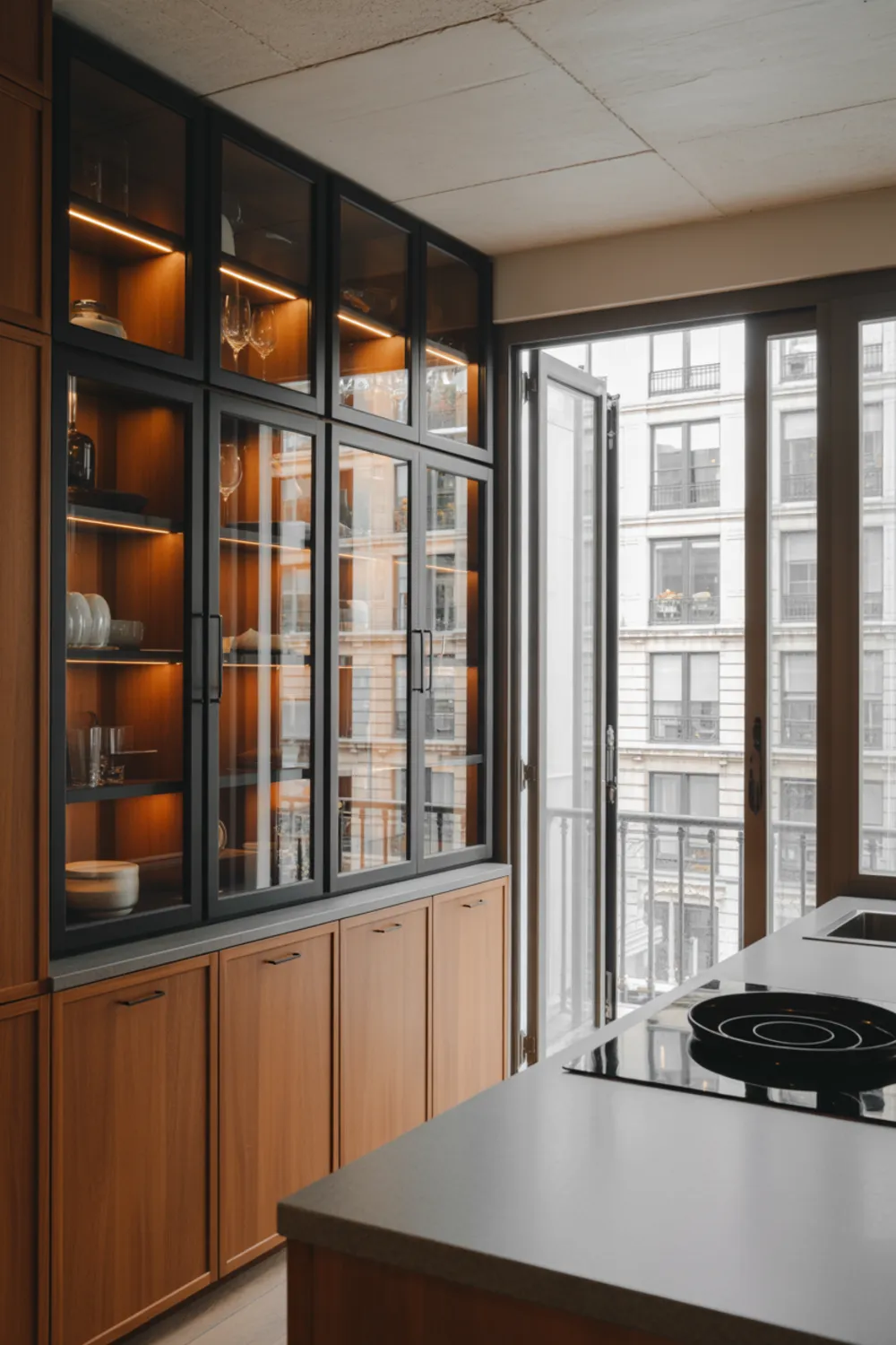 Interior lighting inside the cabinets brings museum-like focus to dishes, barware, or decor. Floor-to-ceiling windows or balcony doors help keep the space bright even with darker framing.