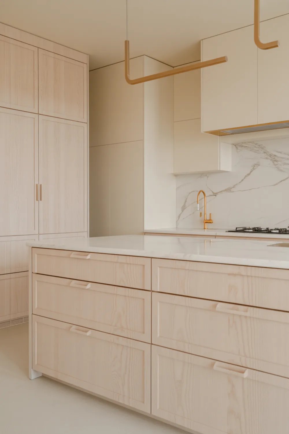 A white oak and marble combination brings a fresh, organic, and high-end feel to everyday cooking routines. You can use rift-sawn oak for a smooth, modern grain that matches minimalist cabinets.