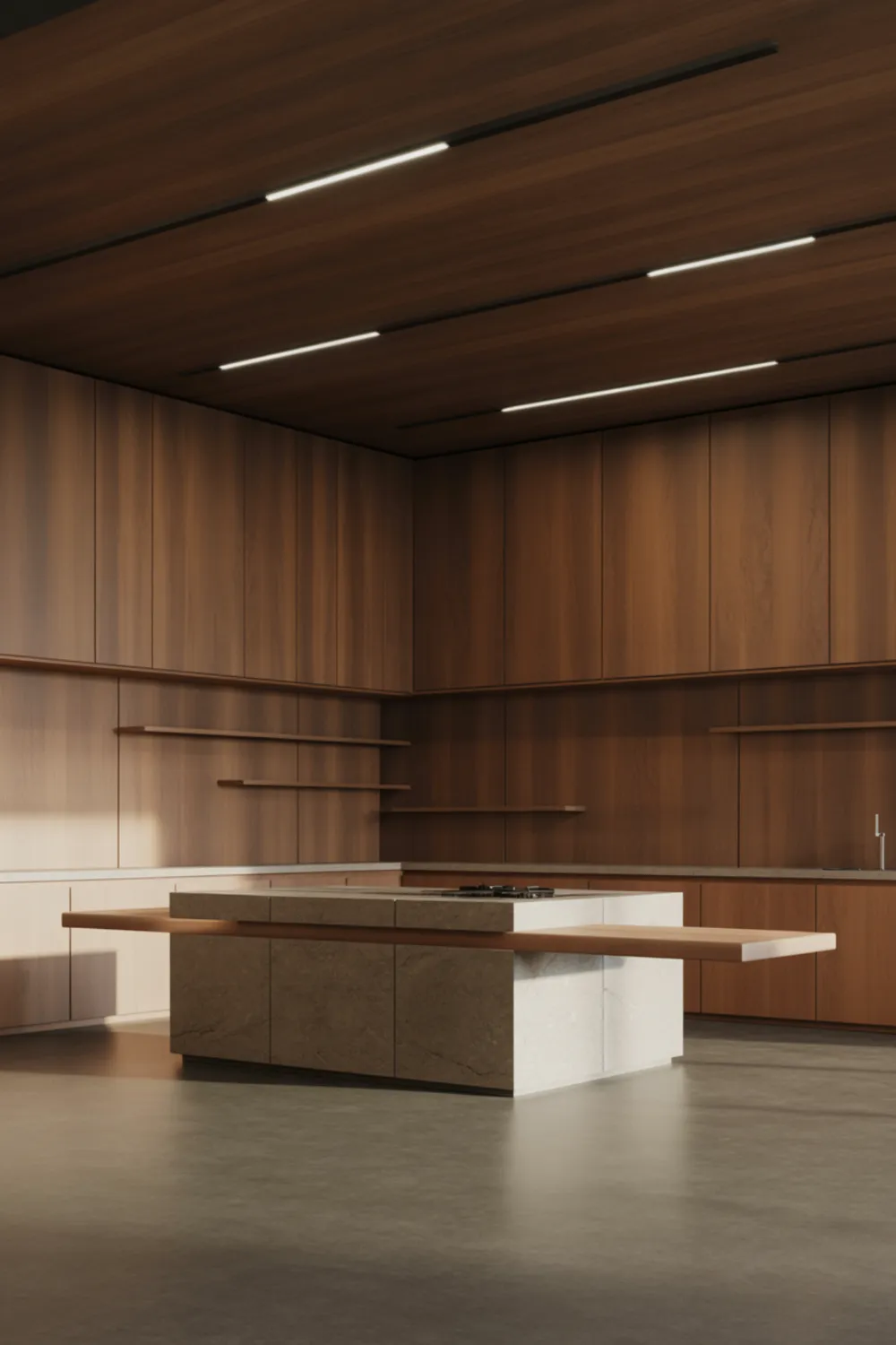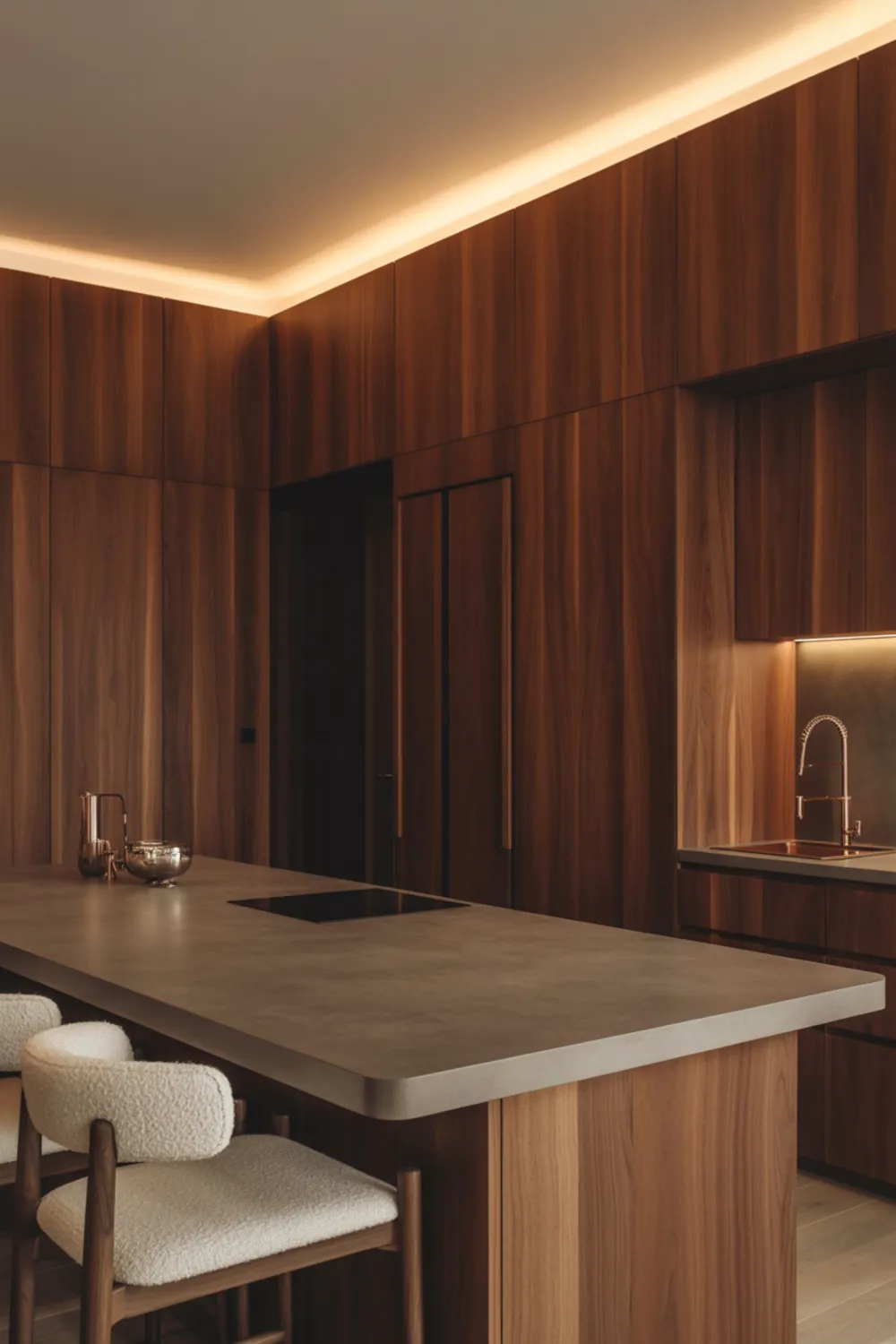5. Warm Walnut Kitchen With Soft Ambient Lighting