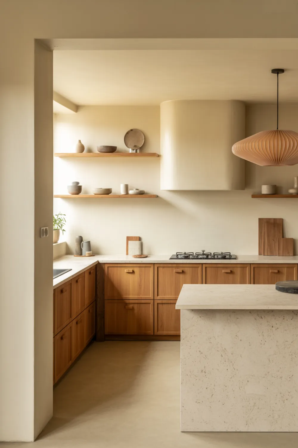 Micro-cement floors or matte stone counters can bring a grounded, earthy feel. Soft, diffused lighting and neutral walls encourage a peaceful cooking rhythm.
