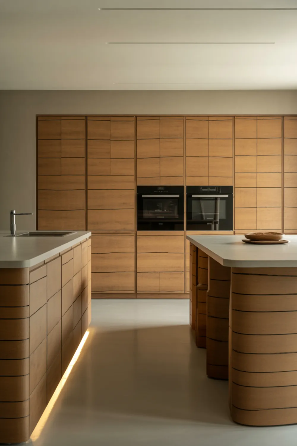 Soft ambient lighting reveals the curves at night and makes the kitchen feel more inviting. Rounded forms reduce sharp edges, which is great for families or open-plan living.