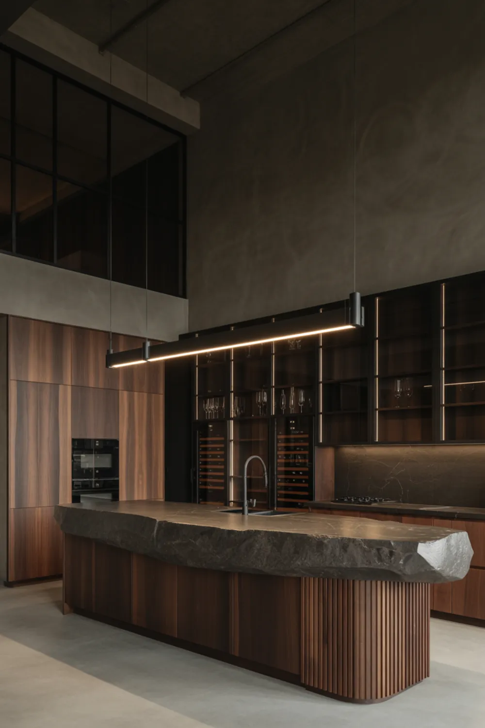 Warm metals like bronze stand out without looking shiny or cold. Low, diffused lighting brings out the natural grain and texture, making the kitchen feel grounded.