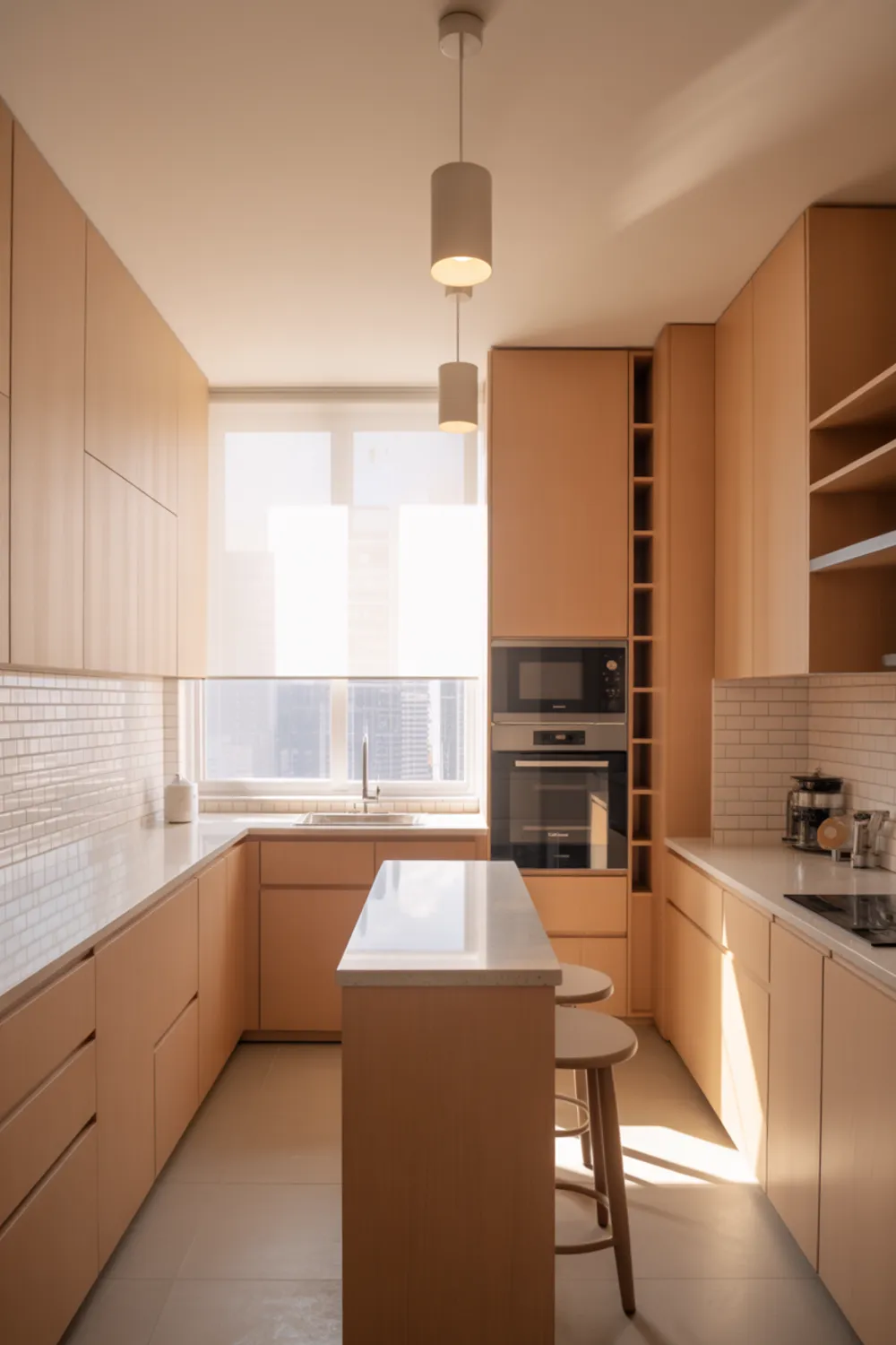 A galley-style layout can feel roomy when you use light wood cabinetry, slim handles, and bright surfaces. You can run cabinetry up to the ceiling for storage while keeping colors muted so the corridor doesnโt feel tight.
