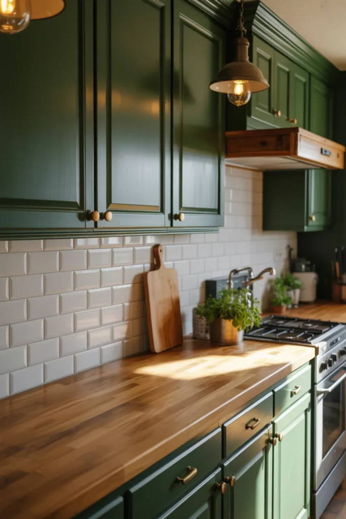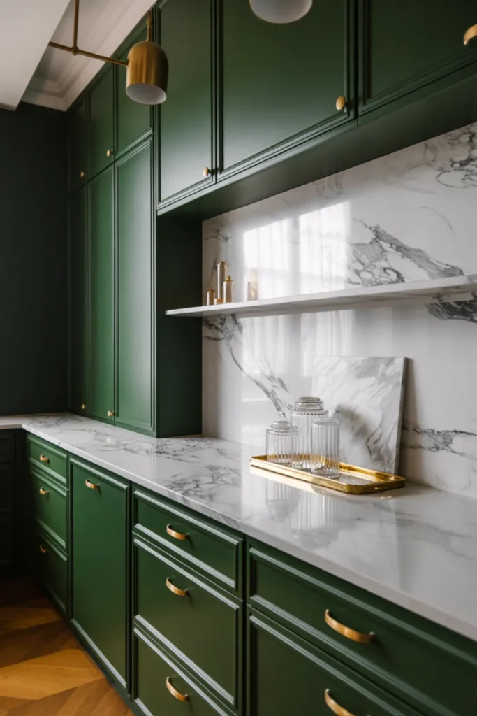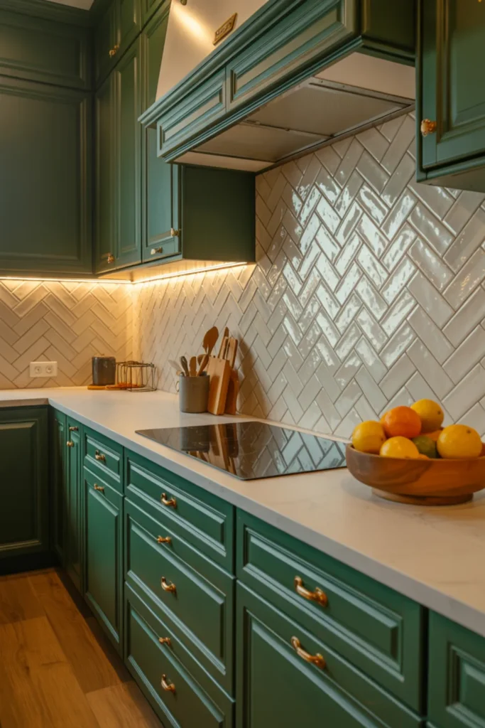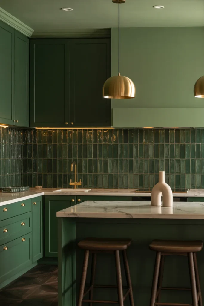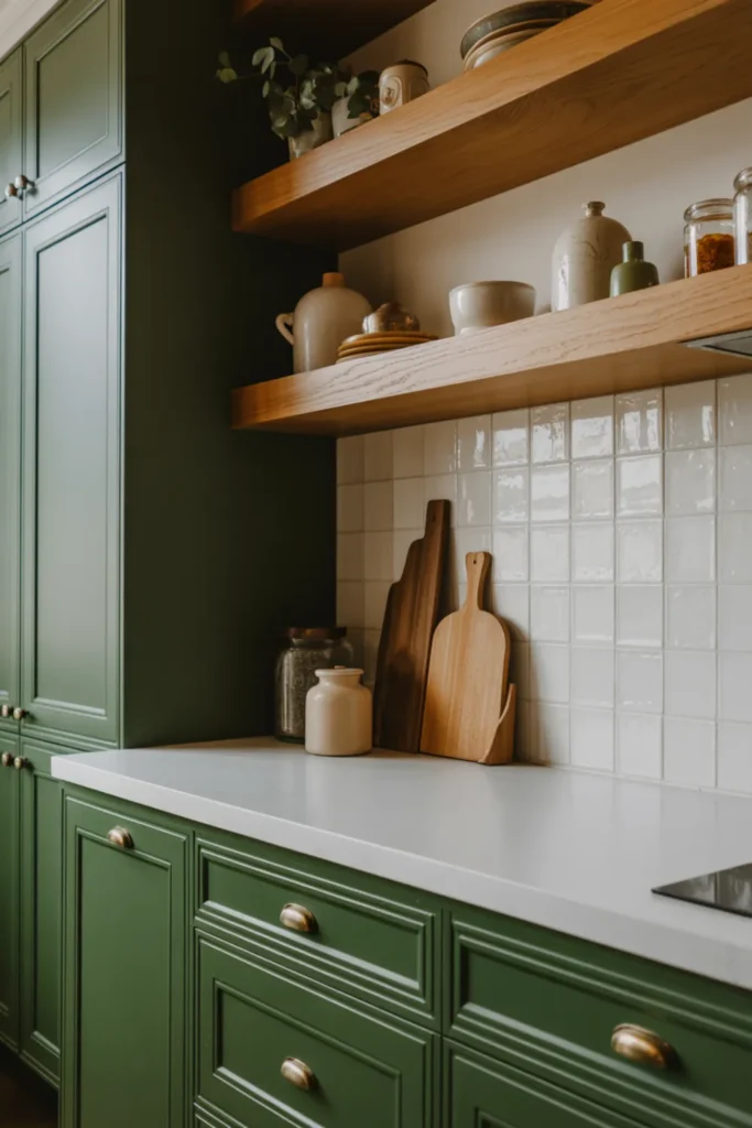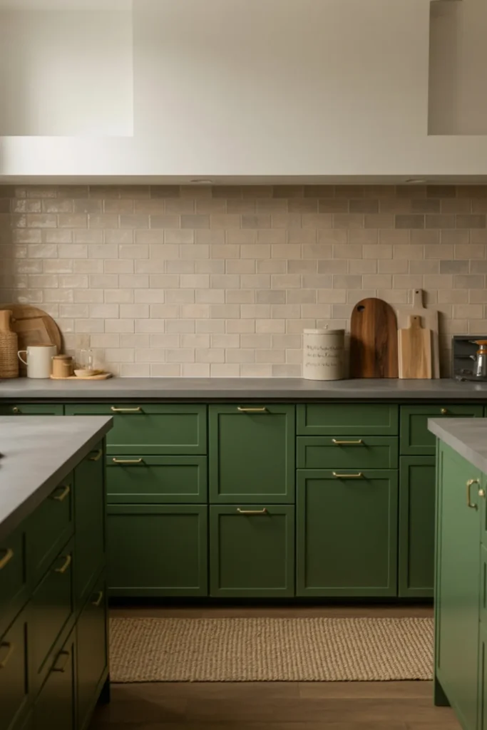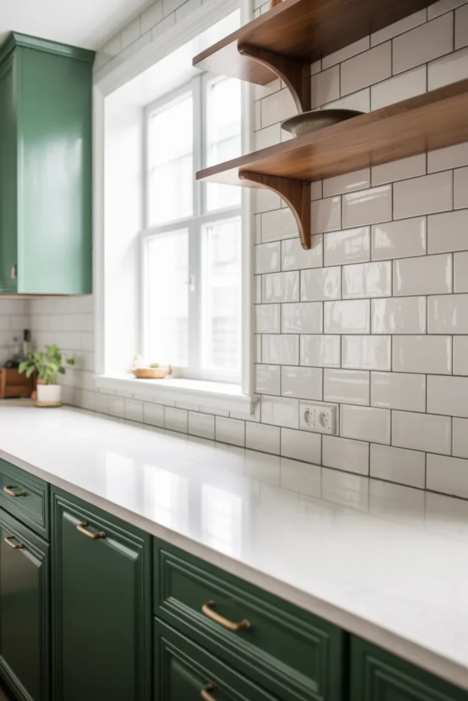 Light quartz countertops and a white backsplash make the green feel fresh, not heavy. Soft lighting helps too, especially at night.